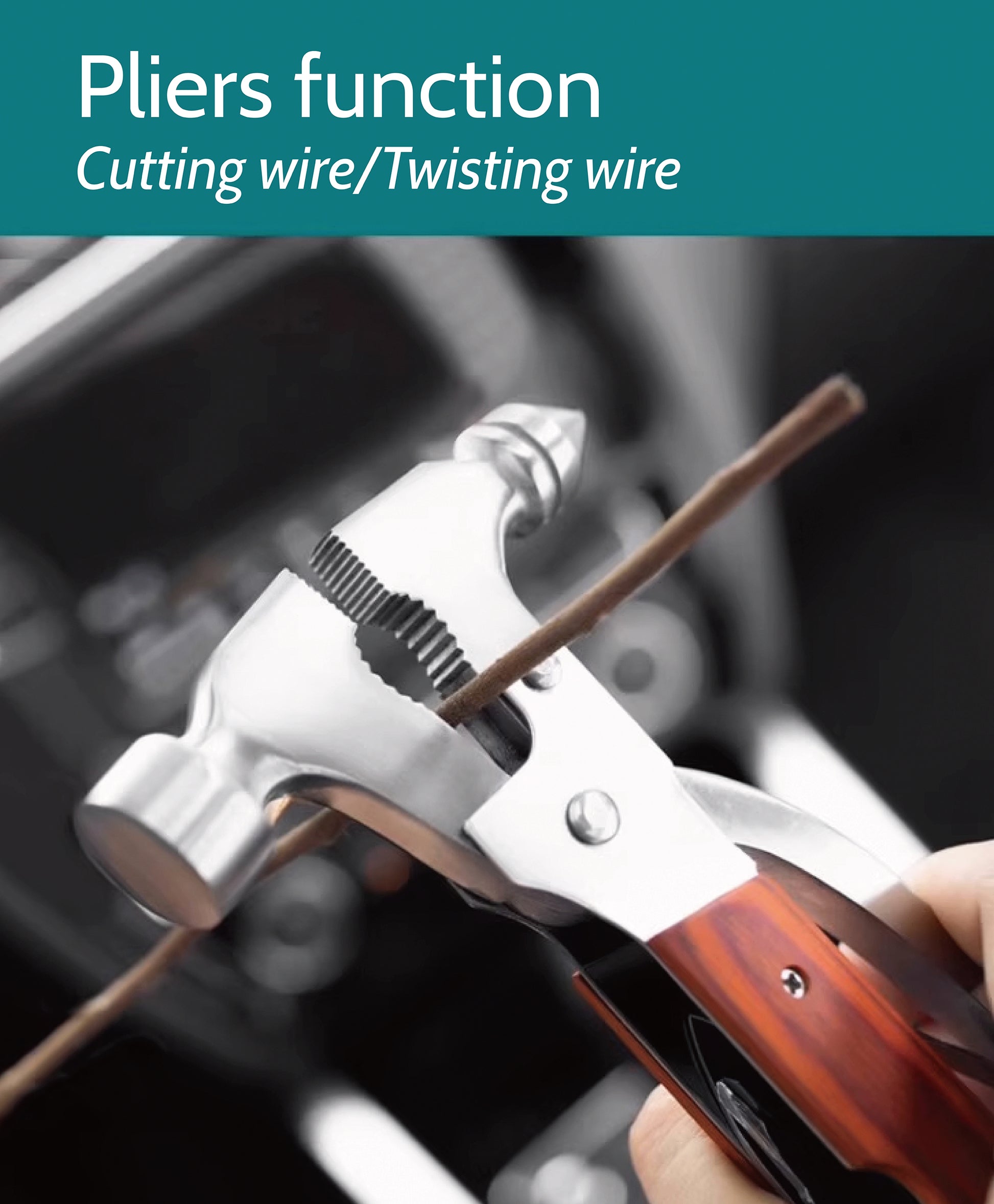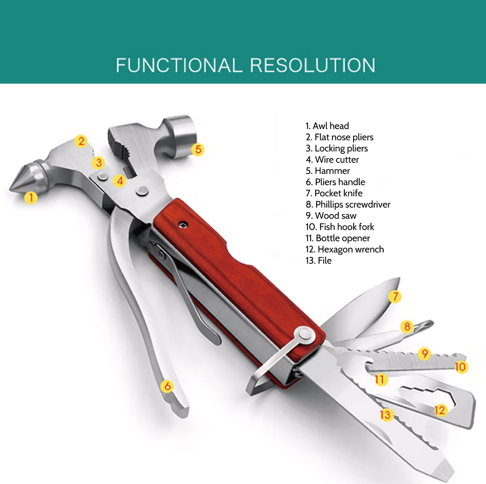 12 In 1 Multi functionality : 12 different tools including a Awl head, Flat nose pliers, Locking pliers, Wire cutter, Hammer, Pliers handle, Pocket knife, Phillips screwdriver, Wood saw, Fish hook fork, Bottle opener, Hexagon wrench, File, Our hammer multitool is a game-changer, packing 12 essential tools into one compact device. This design makes it a must-have tool, especially for various outdoor and household repair works.