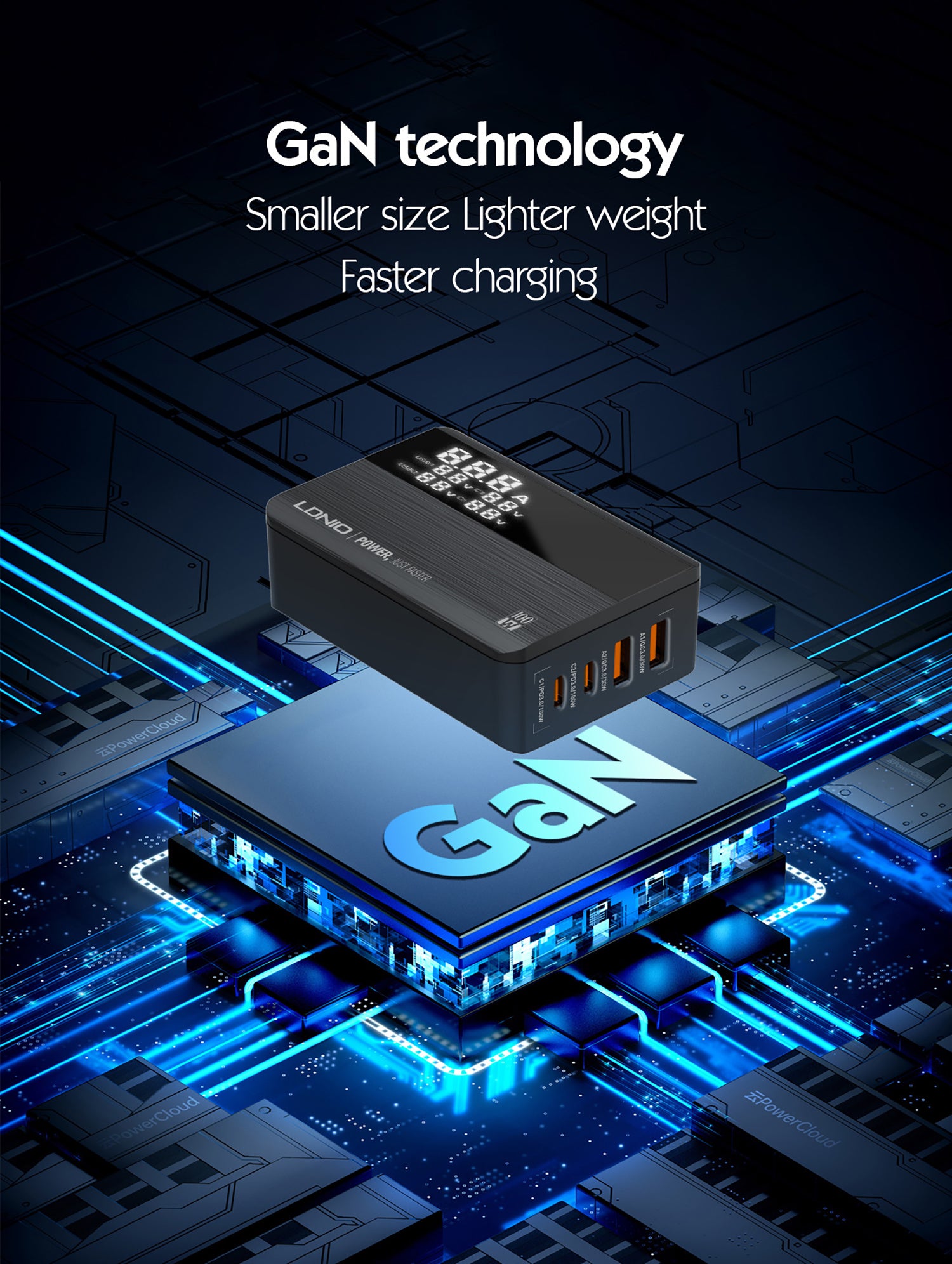 - 【New GaN Technology】 The LDNIO 100W GaN charger upgrades GaN technology to provide a more efficient, compact, powerful and energy efficient charging technology than traditional USB C power supplies. 43% smaller than the original 4×61W charger, the lightweight 3.3*1.1*2.5-inch body and travel-friendly design, 5-ft extension cord and worldwide 100-240 volt AC input voltage make it the ideal desktop charger wherever you go.